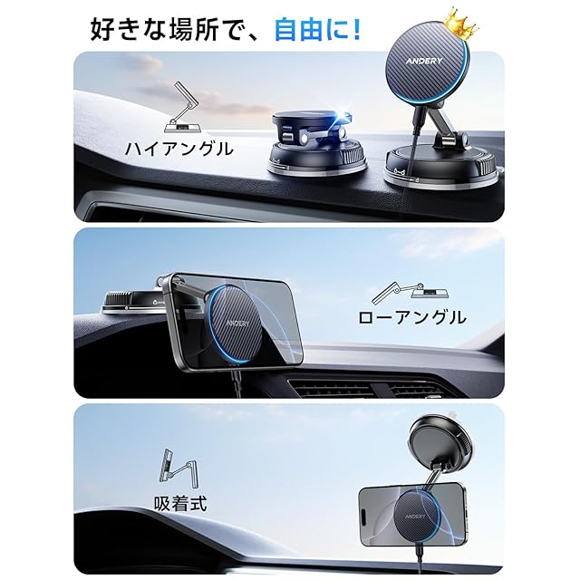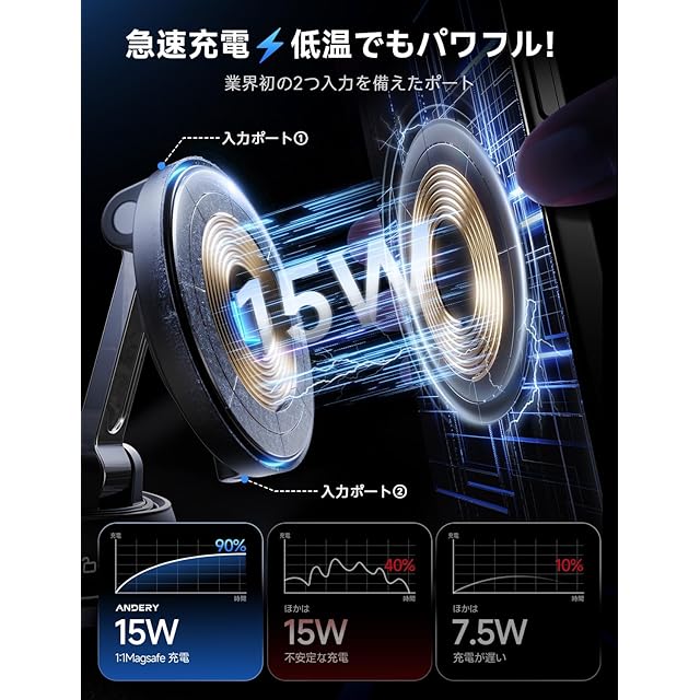 【革新デザイン!15W急速充電+真空ゲル吸盤+超強力磁力、車載スマホホルダー登場】ANDERY開発チームは、お客様の声に応えて大ヒットモデルの車載ホルダーを全面進化させました!新モデルは15W急速充電に対応し、業界初のデュアル入力ポート設計で充電方法がさらに便利に。スマホホルダー 車 ワイヤレス充電はQi認証取得の純正チップを搭載し、スマート温度制御機能で、75%の高効率変換を実現。従来の車載充電器と比べて充電速度が2倍以上向上し、iPhone16シリーズを含む全てのスマートフォンに急速充電が可能です。さらに、ダブルコイルと1:1精密配置の磁気リングで充電安定性を大幅アップ。スマホのバッテリーを保護しながら、充電が途中で切れる心配もありません。真空ゲル吸盤と超強力磁石の組み合わせで、どんな路面状況でもスマホをしっかり固定。忙しい生活の中で、迅速かつ効率的な充電体験を提供し、生活をより効率的で便利にします。