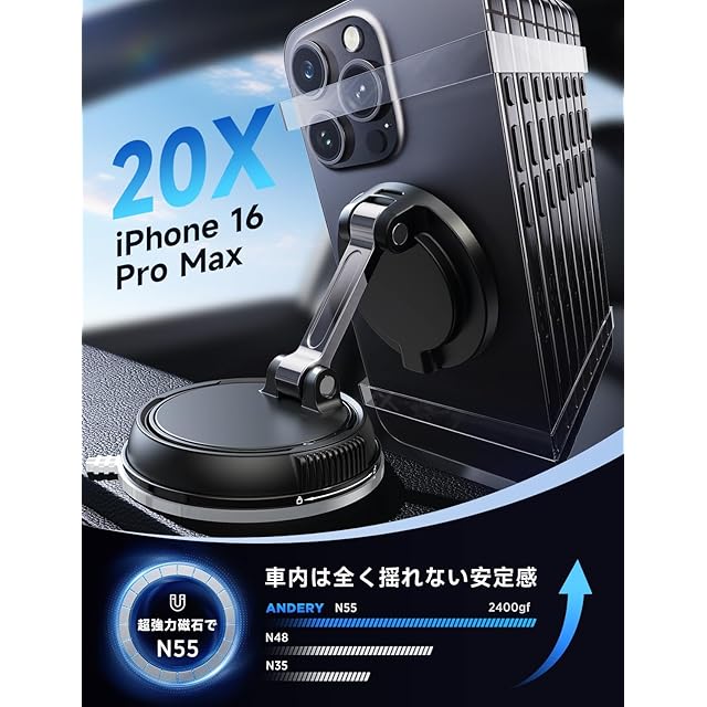 【進化した真空ゲル吸盤&画期的な耐重量56kg&革命的な超磁力】車 スマホスタンドは、 4層ナノ素材を使用したゲル吸盤は従来比50%大きくなり、Na+分子とKa+分子の融合により吸着力と耐久性を大幅に向上させました。 さらに、ノブ式真空ポンプ設計により、耐荷重は56kgを超え、吸着力は市場のスマホホルダー 車 マグネットの50倍で、どんな走行(凸凹道、急ブレーキ、減速帯)でもしっかり固定され、落下の心配がありません。スマホほるだー車のナノゲル素材は、どんな表面にも跡形もなく吸着でき、愛車の表面を傷つけません。また、吸盤の断熱層が増えたことで、夏の高温による脱落問題を解決。極寒の冬でも、炎熱の夏でも、車内でしっかりと固定され続けます。業界最強の24個のN55磁石を採用し、吸着力は通常のマグセーフ 車載の200倍以上!吸着力は最大6kgに達し、これはiPhone 16 Pro Max 20台分の重量に相当します。さらに、独自のS/N双極交替磁場設計により、磁力を最大限に引き出しながらスマホの操作や通信に一切影響を与えません。ANDERYで、毎回のドライブがさらに安心・安全に!
