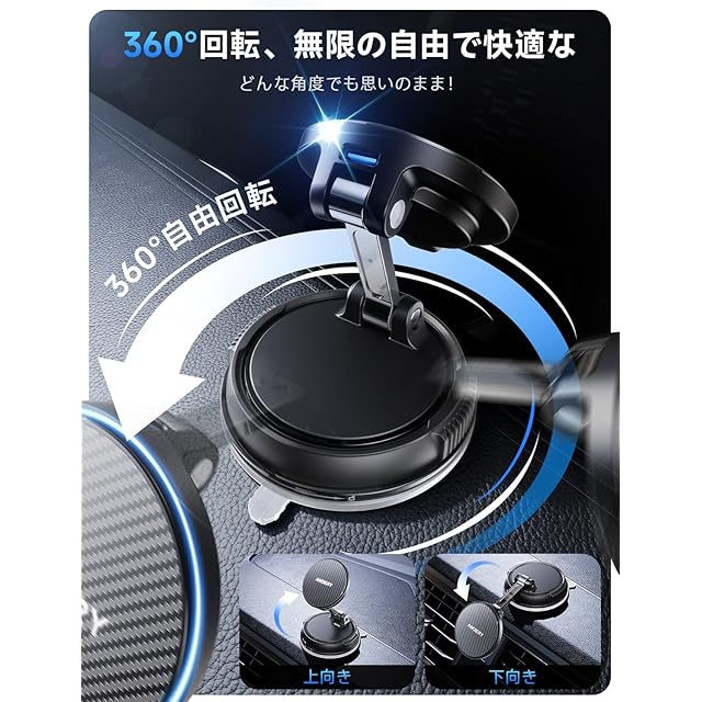 商品名:スマホホルダー 車 ワイヤレス充電 マグネット【15W急速充電+真空吸盤の最強コンビ】安定性拔群 車 スマホスタンド【超強磁力】24×N55磁石 Mag-safe 車載 【360°回転な台座×多角度自由調節】カー用品 車載スマホホルダー LEDライト マグセーフ 車載 充電器 片手操作 1秒で着脱 車用品 携帯ホルダー 折りたたみ式 高級合金素材 iPhone&Android多機種と多車種が対応
