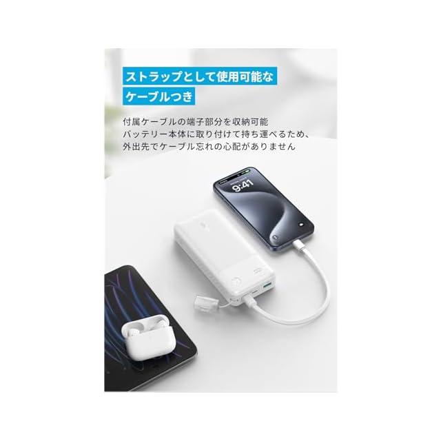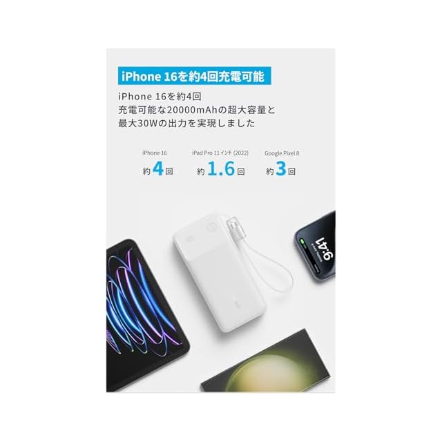 商品名:Anker Power Bank (20000mAh, 30W) (モバイルバッテリー 20000mAh 最大30W出力 USB-C & USB-C ケーブル付属 ディスプレイ搭載) 【PD/PowerIQ搭載/PSE技術基準適合】iPhone 16 / 15 Android iPad その他各種機器対応 (ホワイト)
