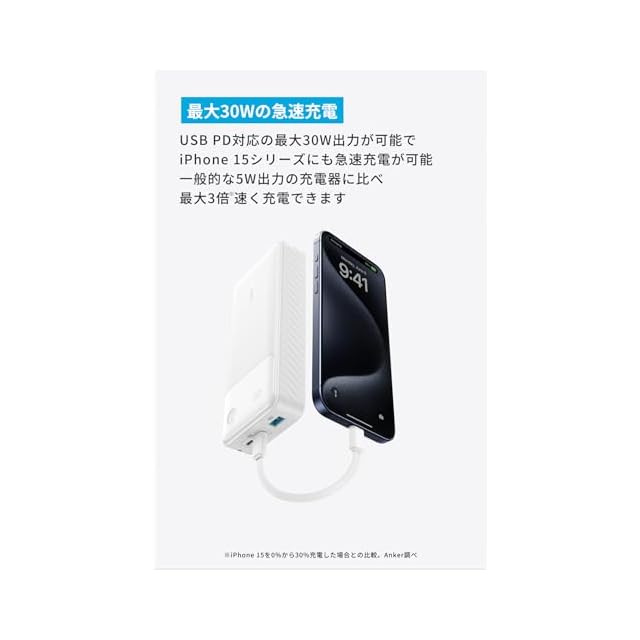 最大30W急速充電:USB PD対応最大30W出力が可能でiPhone 15シリーズにも急速充電が可能です。一般的な5W出力の充電器に比べて最大3倍速く充電できます。※一般的な5W出力の充電器でiPhone 15を0%から30%まで充電した場合との比較(Anker調べ)
