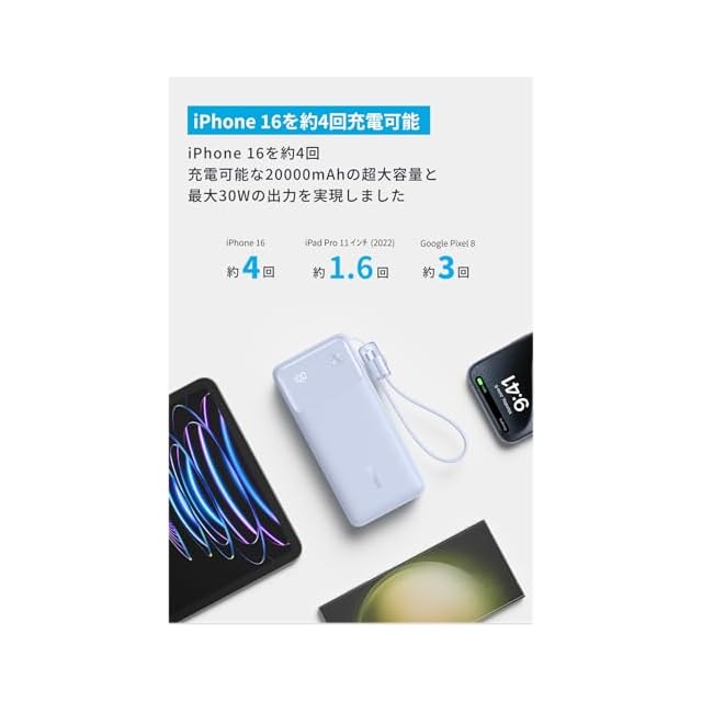 商品名:Anker Power Bank (20000mAh, 30W) (モバイルバッテリー 20000mAh 最大30W出力 USB-C & USB-C ケーブル付属 ディスプレイ搭載) 【PD/PowerIQ搭載/PSE技術基準適合】iPhone 16 / 15 Android iPad その他各種機器対応 (パープル)