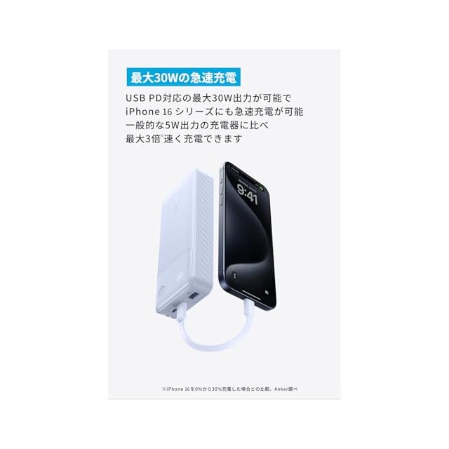 最大30W急速充電:USB PD対応最大30W出力が可能でiPhone 15シリーズにも急速充電が可能です。一般的な5W出力の充電器に比べて最大3倍速く充電できます。※一般的な5W出力の充電器でiPhone 15を0%から30%まで充電した場合との比較(Anker調べ)