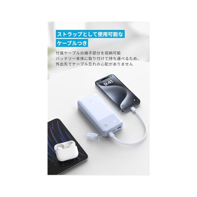 ストラップとして使用可能なケーブルつき:同梱ケーブルを付属のストラップに収納可能です。バッテリー本体に取り付けて持ち運べるため、外出先でケーブル忘れの心配がありません。