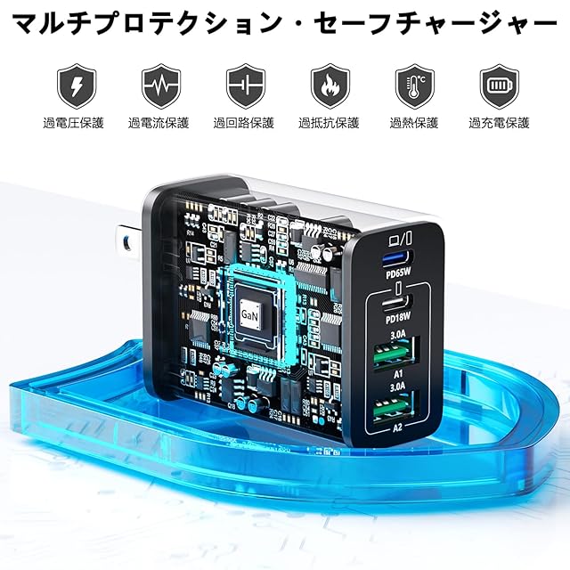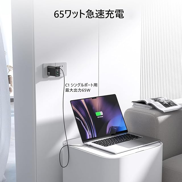 商品名:65W USB C充電器 タイプC GaN 急速充電器 4ポート搭載 コンパクトPDプラグ [2x USBC+2x USBA] 壁掛けソケット 最大4台同時充 PSE技術規格準拠 PD3.0/QC3.0/PPS高速充電 MacBook/タブレット/ノートパソコン/iPad/iPhone/Androidなど様々なデバイスに対応 2MのUSB-Cケーブルが付属する