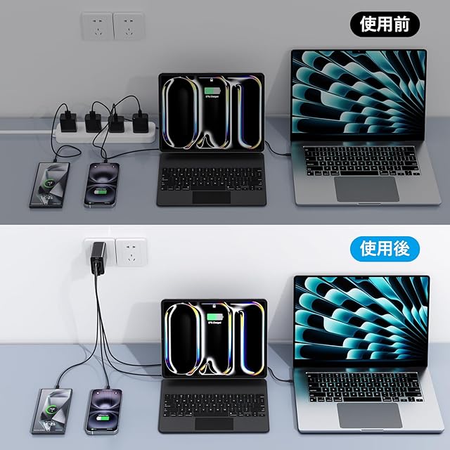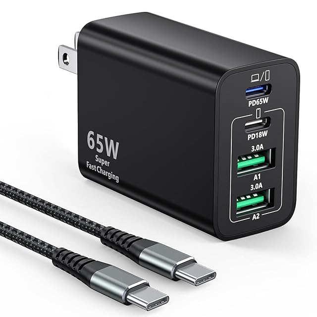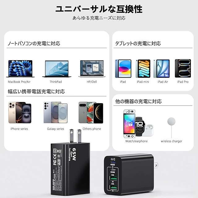 ユニバーサル互換性:USB Type-C充電器はノートパソコン、携帯電話、タブレットに対応します。対応しますMacbook/HP/Dell/ThinkPad/iPad/iPhone 16/16 Plus/16 Pro/16 Pro Max/15/15 Plus/15 Pro/15 Pro Max/14/14 Plus/14 Pro/14 Pro Max/13 /13 Pro/13 Pro Max/13 Mini/12/12 Pro/12 Pro Max/12 Mini/11/11 Pro/11 Pro Max/XS/XS Max/XR/X/8/8 Plus/7/7 Plus/6/6S/SE 2020/Galaxy S24/S23/S22/S21/S20/S10/S9/S8/S7/S6/A12/A13/A22/A32/A52/A53/A71/Note 20/10/LG/Google Pixel/タブレットおよびその他のUSB/USB C低電力電子機器。注:最初のPD65Wポートだけがあなたのラップトップを充電することができます、間違ったポートに接続しないでください。