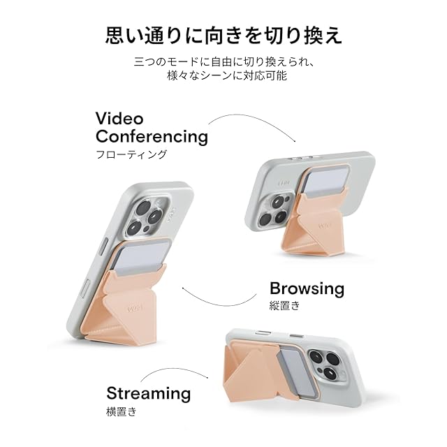 【三つの使用モード・自由に切り換え】マグネット内蔵で、MagSafe対応機種(iPhone16/15 /14/13/12シリーズ)にお使いいただけます。縦置き、横置き、フローティングモードに自由に切り換えられ、様々なシーンに対応可能です。