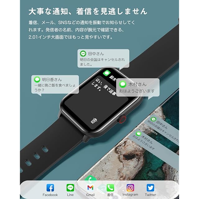 ☪【1.9インチ超大画面・着信/メッセージ通知】スマートウォッチ は1.9インチの高解像度大画面を採用され、より高精度な大画面で快適な視覚感を実現できます。着信通知、LINE、Twitter、Instagram、Facebookなどアプリからのメッセージを表示できて、大事な通知をすぐ確認できます。腕時計はタッチスクリーンで、触感が抜群で、腕を上げると腕時計のスクリーンが自動的に点灯し、真っ暗な夜でも時間をはっきり見ることができます。