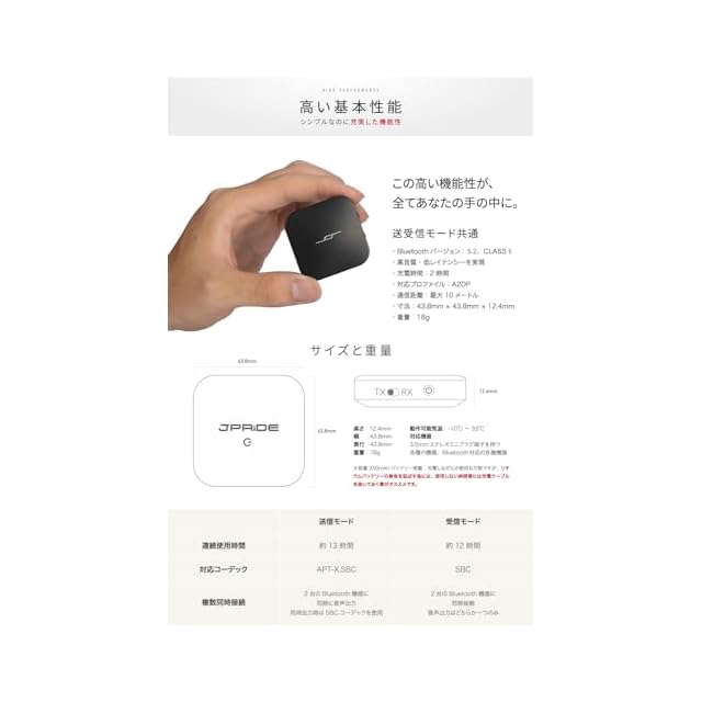 ✅ メーカー1年 (*) Bluetoothバージョン:5, CLASS II, (*) 高音質・低レイテンシーを実現:APT-X, APT-X LL, SBC コーデック対応 (*) 充電時間:約2時間 (*) 対応プロファイル: A2DP (*) 周波数帯: 2.4GHz (*) 通信距離:最大10メートル (*) 大容量 250mAh バッテリー (*) 寸法: 43.8mm x 43.8mm x 12.4mm (*) 重量:18g (*) 動作可能気温:-10℃ ~ 55℃ (*) 対応機器:3.5mmステレオミニプラグ端子を持つ各種機器、Bluetooth 対応機器 (※) 本製品の対応プロファイルは、 A2DP のみとなっています。スマホ通話・電話会議用途での使用が必要な場合、HSP プロファイルに対応した製品が必要となります。【FAQ】電波状況や相手機器の問題によって接続が不安定となるケースでは、本機と相手機器のリセット操作で多くの状況が改善します。 Designed by JPRiDE Tokyo. Manufactured in China.