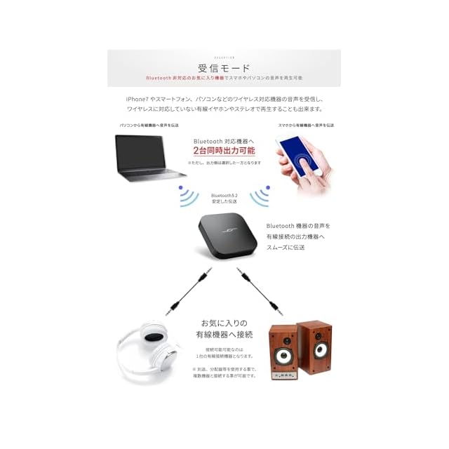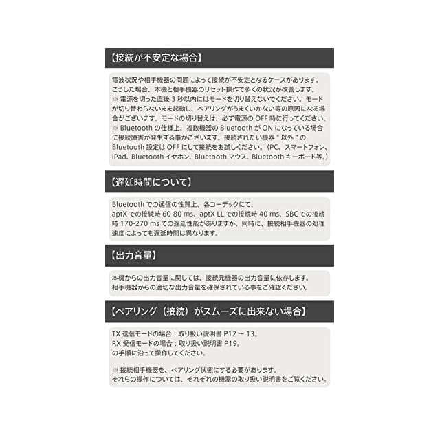 ✅【2台同時接続 受信機(レシーバー)モード 】 本機でスマートフォンやパソコンなどのワイヤレス対応機器の音声を受信し、ワイヤレスに対応していない有線イヤホンやステレオで再生。対応コーデック: SBC。(*) 連続使用時間(受信モード): 約12時間 (*) 対応コーデック(受信モード):SBC (*) 複数同時接続(受信モード): 2台のBluetooth機器を同時接続可能(この際、音声の出力はどちらか一つのみとなります)【遅延時間について】※ Bluetooth での通信の性質上、各コーデックにて、aptX での接続時 60-80 ms、aptX LL での接続時 40 ms、SBCでの接続時 170-270 ms での遅延性能がありますが、同時に、接続相手機器の処理速度によっても遅延時間は異なります。【出力音量】について本機からの出力音量に関しては、接続元機器の出力音量に依存します。相手機器からの適切な出力音量を確保されている事をご確認ください。