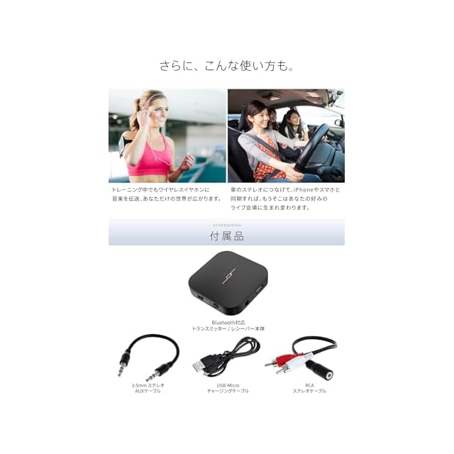 【 ワイヤレス非対応機器を カンタンに ワイヤレス化 】<br> 面倒な配線をいじくらなくても、ワイヤレス接続に対応していない機器をワイヤレスで使用する事ができる便利なアダプターです。aptX LL, aptX コーデック対応の高音質を、低レイテンシーで音声遅延を極限まで抑えます。<br> <br> 【 一台二役 Bluetooth トランスミッター / レシーバー 】<br> これ一台で、送信機としても受信機としてもお使いいただけます。<br> 送信・受信モードの切り替えはスイッチ一つでカンタン。切り替え可能。<br> <br> <br> 【 送信機(トランスミッター)モード 】<br> ワイヤレス送信に対応していない機器(テレビ、スピーカー、コンポなど)の音声を本機に入力し、<br> 本機からお手持ちのBluetooth 対応機器(ワイヤレスイヤホンなど)に送信し、ワイヤレス再生。<br> 対応コーデック: aptX LL, aptX, SBC。<br> <br> 使い方の例:ワイヤレス対応でないテレビの音声をワイヤレスで再生。<br> テレビのヘッドフォン出力端子(3.5mm ステレオ端子)からの音声を本機に入力。本機とお手持ちのブルートゥーススピーカーやワイヤレスイヤホンがBluetoothで無線接続され、テレビの音声がワイヤレス機器から再生できます。<br> <br> 2台同時接続も可能:入力機器の音声を、2台のbluetooth機器で同時に再生する事ができます。<br> <br> <br> 【受信機(レシーバー)モード 】<br> 本機でスマートフォンやパソコンなどのワイヤレス対応機器の音声を受信し、ワイヤレスに対応していない 有線イヤホンやステレオで再生。対応コーデック: SBC。<br> <br> 使い方の例:お気に入りの 高音質有線ヘッドフォンで、iphone7 の音声を聞く。<br> 受信機モードにした本機と iphone7 をBluetoothで接続し、有線イヤホンの入力端子を本機のステレオ端子に接続。<br> <br> 2台同時接続も可能:2台のBluetooth機器の音声を同時に接続する事ができます。ただしこの際、音声を出力できるのは、どちらか一つのBluetooth機器のみです。<br> <br> <br> 【 高い基本性能 】<br> <br> * メーカー1年<br> <br> (送受信モード共通)<br> * Bluetoothバージョン: 5 , CLASS II, <br> * 高音質・低レイテンシーを実現<br> * 充電時間:約2時間<br> * 対応プロファイル: A2DP<br> * 通信距離:最大10メートル<br> * 大容量 250mAh バッテリー搭載:<br> * 寸法: 43.8mm x 43.8mm x 12.4mm<br> * 重量:18g<br> * 動作可能気温:-10℃ ~ 55℃<br> * 対応機器:3.5mmステレオミニプラグ端子を持つ各種の機器、Bluetooth 対応の各種機器<br> <br> <br> (送信モード)<br> * 連続使用時間: 約13時間<br> * 対応コーデック:aptX LL, aptX, SBC<br> * 複数同時接続: 2台のBluetooth機器に同時に音声出力(この際、同時接続時のコーデックは自動的にSBCとなります)<br> <br> (受信モード)<br> * 連続使用時間: 約12時間<br> * 対応コーデック: SBC<br> * 複数同時接続: 2台のBluetooth機器を同時接続可能(この際、音声の出力はどちらか一つのみとなります)<br><br>参考価格又は価格に表示されているセール価格との比較対照価格は、最近相当期間にわたって販売されていた価格です。