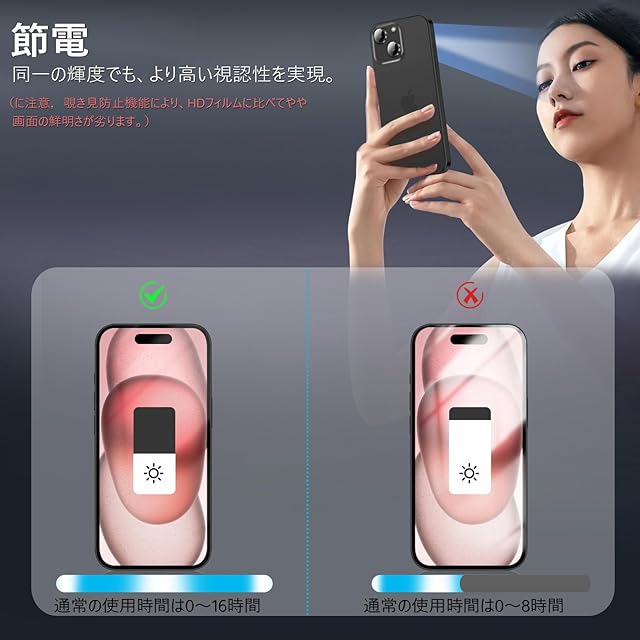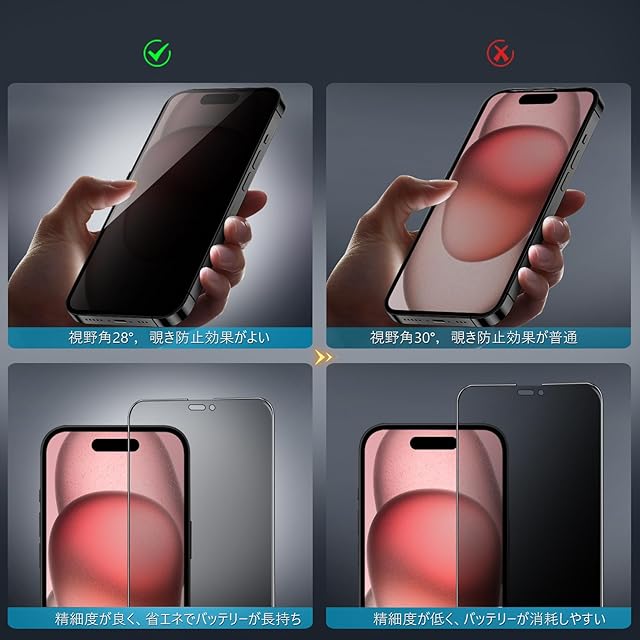 【360度覗き見防止,プライバシーフィルム】 iPhone15の360度覗き見防止フィルム,上下左右4方向の360度(前から约28度の視視角)のぞき見防止。正面から見る時はっきり見える、高透過率があり,側方から見るときにはブラインドを通して画面が徐々に暗くなる。画面の表示内容や個人情報は完璧に保たれ、周りからののぞきを心配せずにLINEやメールを交換できます。