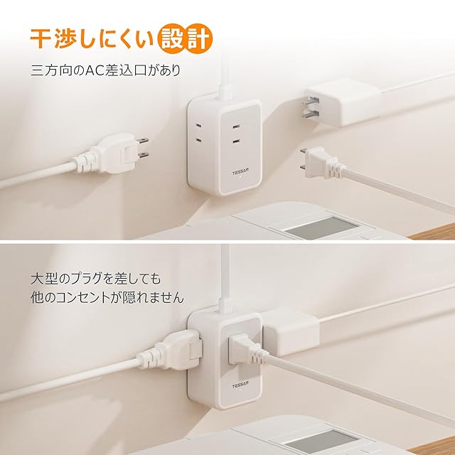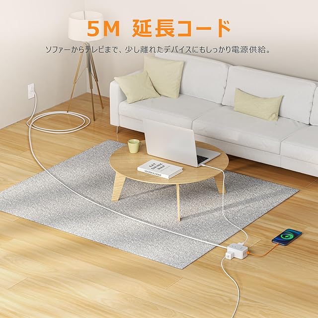 【一台6役/干渉しにくい】この延長コードは正面と左右に1口ずつACコンセントを搭載しているほか、USBポート(USB-A2、USB-C1)も3口用意されています。そのため、最大6台まで同時に充電が可能で、コンセントが足りないという問題を解決します。また、ACコンセントが左右に分散しているため、使用時の干渉を防ぎながら接続可能です。