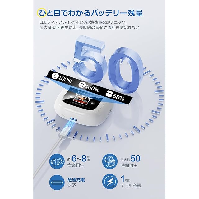 商品名:イヤホン bluetooth ワイヤレスイヤホン 【2025年世界初登場Bluetooth6.0&多機能タッチスクリーン】 ぶるーとぅーす ブルートゥース イヤホン探し ANC&ENCノイズキャンセリング 外音取込 ゲームモード IPX7防水 最大50時間再生時間 自動ペアリング マイク付き 小型/軽量 Type-C充電 iPhone/Android/Pad適用 スポーツ/通勤/通学/WEB会議