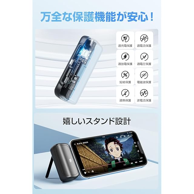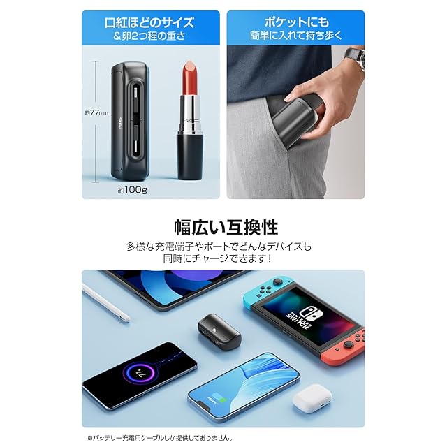 【手のひらの小型・約100g& 安全保護機能付き】約100gの軽量卵の2個ほどの重さは、リップスティック型で片手に収まるサイズは、スマホと重ねて持って操作も邪魔になりません。過充放電防止、短路防止や過負荷防止など安全機能も備わっていて、極めての安全性を追求します。】独自技術スマートチップ機能を採用しているため、接続されたデバイスに適した条件で充電が行えます。「低電流モード」を搭載しているのもポイント。長年使用しても安全上の懸念はありません。