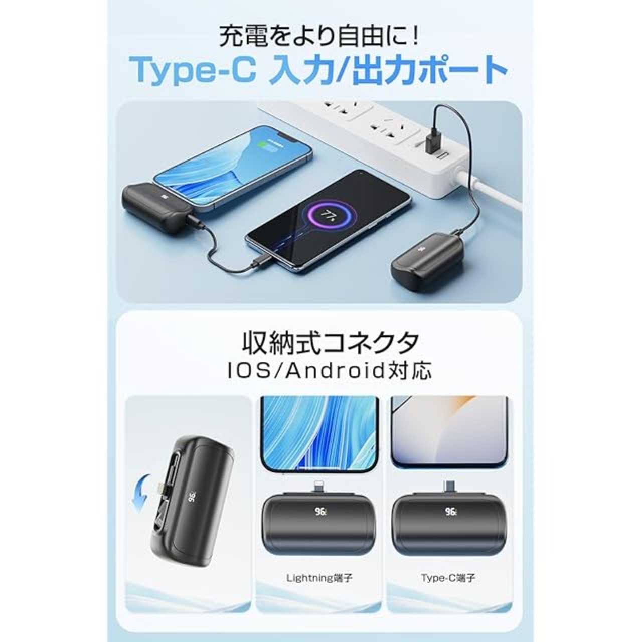 【二台同時充電可能&全機種対応&LightningとType-Cコネクター内蔵】出力にはType-Cポートと2規格のコネクター内蔵で2台同時に充電可能です。入力にも蓄電にもType-Cポートができ、お持ち運びが便利になります。余裕なケーブルが必要なく、カバンに沢山ある煩わしいケーブルの収納も一気に解決してくれます。歩いてスマホを充電しながら、ゲームやビデオなど引き続き楽に利用できます!