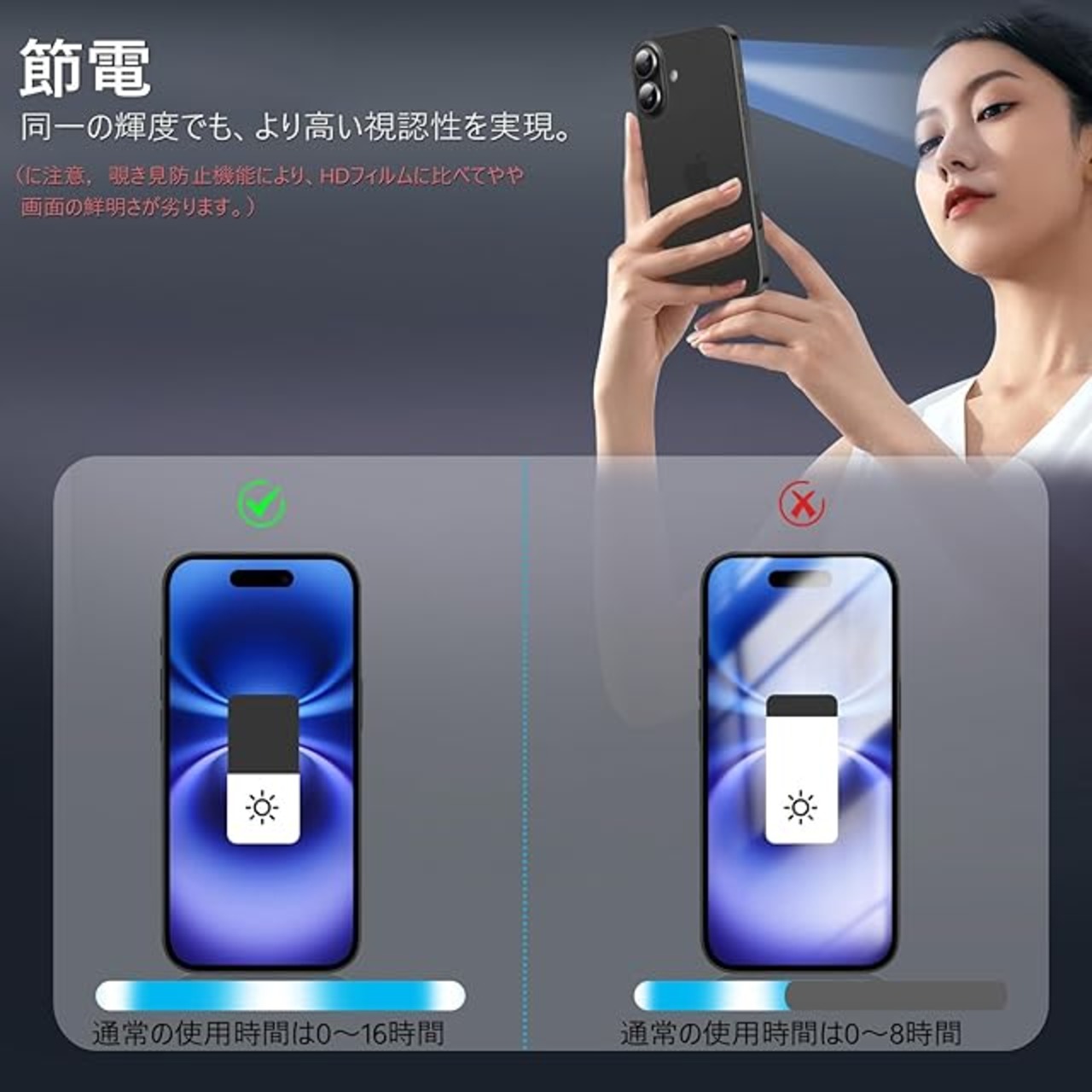 【360度覗き見防止,プライバシーフィルム】 iPhone16Plusの360度覗き見防止フィルム,上下左右4方向の360度(前から约28度の視視角)のぞき見防止。正面から見る時はっきり見える、高透過率があり,側方から見るときにはブラインドを通して画面が徐々に暗くなる。画面の表示内容や個人情報は完璧に保たれ、周りからののぞきを心配せずにLINEやメールを交換できます。