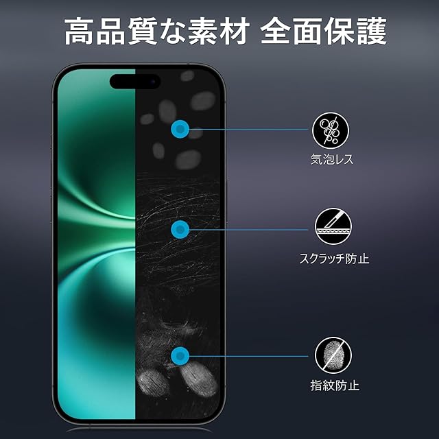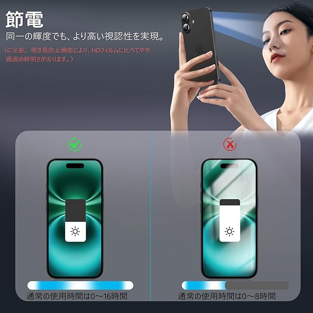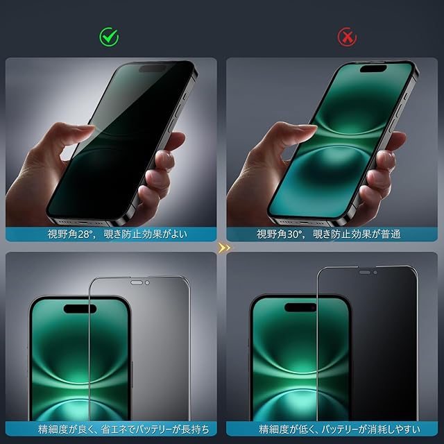 【360度覗き見防止,プライバシーフィルム】 iPhone16の360度覗き見防止フィルム,上下左右4方向の360度(前から约28度の視視角)のぞき見防止。正面から見る時はっきり見える、高透過率があり,側方から見るときにはブラインドを通して画面が徐々に暗くなる。画面の表示内容や個人情報は完璧に保たれ、周りからののぞきを心配せずにLINEやメールを交換できます。