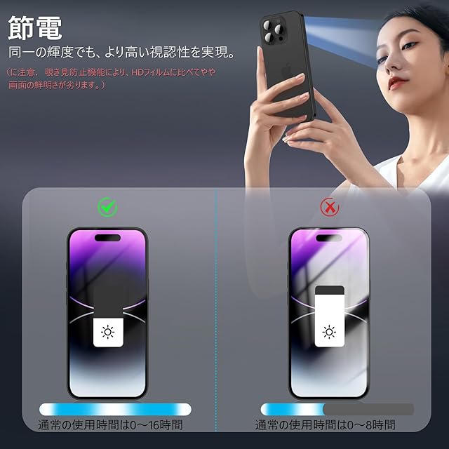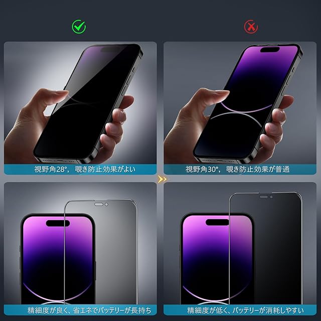 【360度覗き見防止,プライバシーフィルム】 iPhone14Promaxの360度覗き見防止フィルム,上下左右4方向の360度(前から约28度の視視角)のぞき見防止。正面から見る時はっきり見える、高透過率があり,側方から見るときにはブラインドを通して画面が徐々に暗くなる。画面の表示内容や個人情報は完璧に保たれ、周りからののぞきを心配せずにLINEやメールを交換できます。
