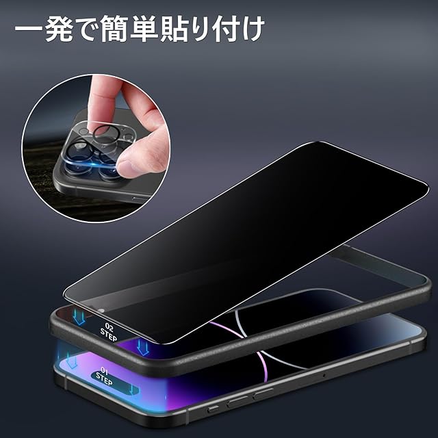 【ガイド枠付き,初心者でも綺麗に貼れる】 ガイド枠をはめる→上側に合わせて、フィルムを置く→軽く押すだけで自然に吸着。初めての方でも簡単に貼り付けられるよう、専用の貼り付けガイド枠を同梱しています。いPhone14Pro max ガラスフィルムがズレることなく、だれでも簡単にフィルムを貼ることができます。