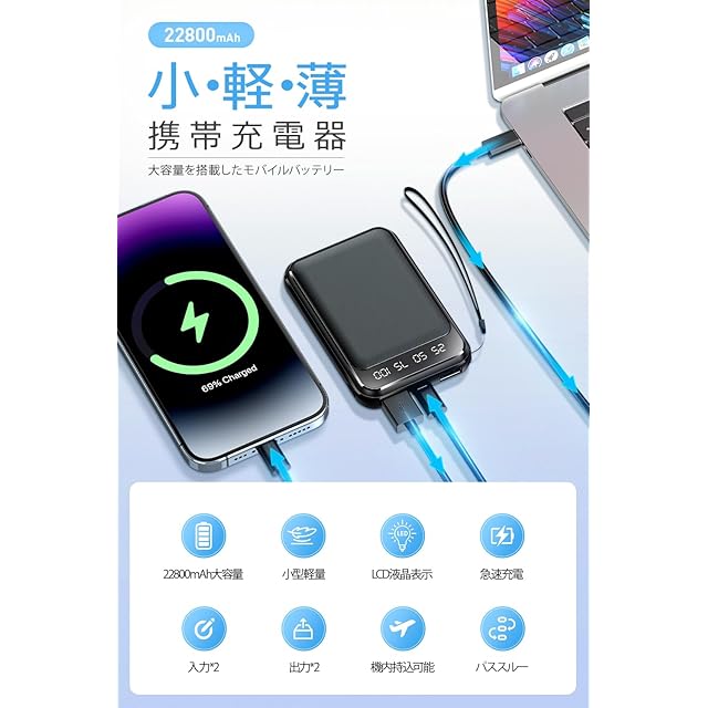 商品名:モバイルバッテリー 小型 大容量 22800mAh 【超軽量180g 2台同時充電】 急速充電 2個USB出力ポート搭載 LCD残量表示 スマホ 充電器 携帯充電器 2way入力 パススルー機能 ストラップ付き 携帯バッテリー コンパクト 持ち運び便利 機内持ち込み可能 パワーバンク 安全設計 多種保護 アウトドア/旅行/出張/防災/停電対策/緊急用 iOS/Android各種他対応 (黒色)