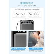 【2way蓄電 LCD残量表示付き】Type-C、microUSB用の2つの入力ポートを搭載し、付属の充電コードや別途用意するケーブルで本体へ蓄電できます。LCDディスプレイにより、ボタンを1回押すと数字が光って表示され、バッテリー残量が一目瞭然、充電のタイミングがより掴みやすく、充電切れの心配もありません。さらに、モバイルバッテリー本体へ充電しながらスマホやタブレットにも充電できるパススルー機能に対応しています。