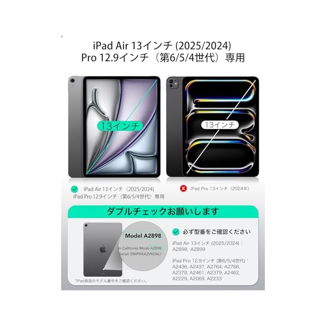 【互換性】:iPad Air 13インチ(2025/2024)、iPad Pro 12.9インチ(第6/5/4世代、2022/2021/2020)専用です。モデル: A2898、A2899、A2378、A2461、A2379、A2462、A2229、A2069、A2232、A2233、A1876、A2014、A1895、A1983。他のiPadモデルと互換性がありません。