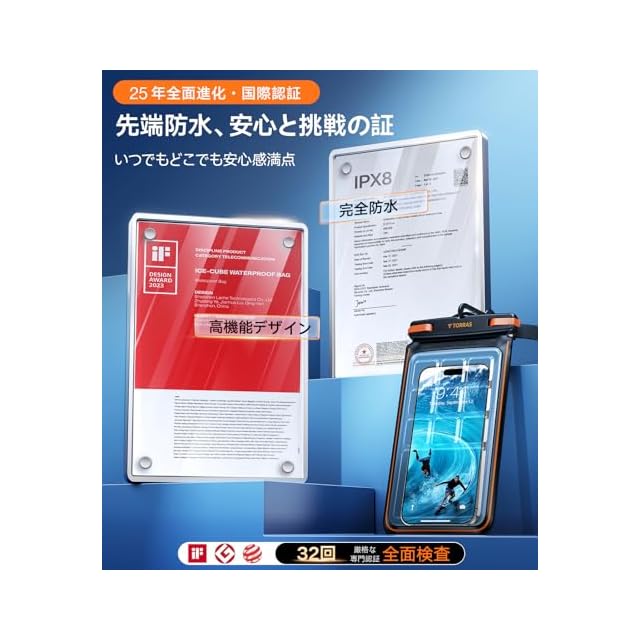 【世界基準を大幅超える100FT防水!国際認証で超安心】IPX8認証は勿論、さらにその基準を遥かに超える防水性能を備えており、水深100FTで30時間水浸しても一滴の妥協もなし。洗剤水や海水などの腐食にも強いです。これだけでなく、2023 年にRedDot、iF、GoodDesignの3 大デザイン賞を受賞した高機能な製品で、美しく安心して携帯電話を全面的に保護できます。ビーチではサーフィン中も iPhone をケースに入れたままに写真撮影、温泉では音楽を流しながらゆっくり浸かろう!【IPX8認証番号:SZIN2103003090PS】