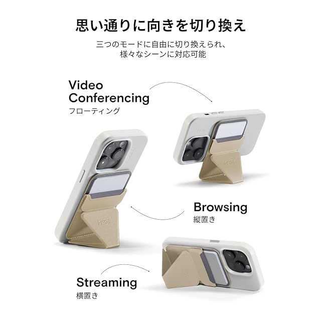 【三つの使用モード・自由に切り換え】マグネット内蔵で、MagSafe対応機種(iPhone16/15 /14/13/12シリーズ)にお使いいただけます。縦置き、横置き、フローティングモードに自由に切り換えられ、様々なシーンに対応可能です。