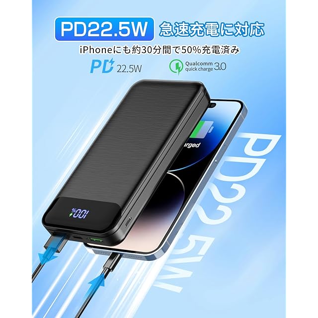 【PD22.5W+QC 3.0技術&モバイルバッテリー タイプc】2つのUSB出力ポート搭載、入出力兼用Type-Cポートに加え、3台同時充電が実現され、外出先で家族、友達とシェアできるし、USB充電器としてスマホ以外にもタブレットやゲーム機を持ち運ぶ方におすすめ。弊社独自の急速充電技術がさらに進化、高精度・高安定度の出力電圧、出力電流の活用により高効率充電を達成しました。二つUSB-Aポートは、PD22.5Wの急速充電に適しており、QC18W急速充電と互換性があります。バッテリーのType-CポートはiPhoneとAndroidの両方と互換性のあるPD18W急速充電をサポートしており、どのスマホを使用しても対応できます。