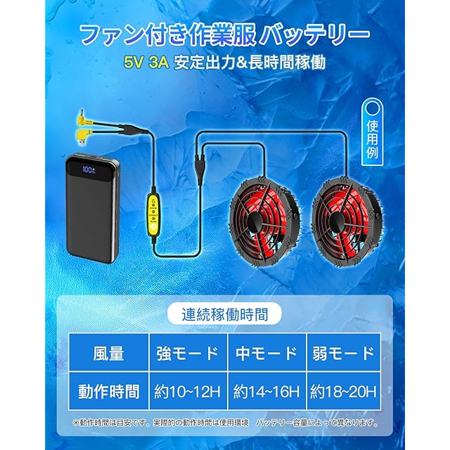 【モバイルバッテリー大容量30000mAh&超時間稼働&高い互換性 】バッテリーの容量30000mAhで、超時間稼働することが実現できます。風量モードにより使用時間は約12‐15時間になります(実際の使用状況により異なります)。pdもばいるバッテリーには5V 3A安定な出力で、空調作業服/ネッククーラー/ペルチェベストなどではなく、iPhone iPad Android各種電子製品に適用です。この1台で様々なシーンで大活躍です!