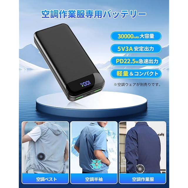 【空調ウェア 専用バッテリー&5V 3A安定出力】空調ウェアを安/定的に利用するために、さらに高い導電率性能を持つ次世代 空調ウェアー専用モバイルバッテリーを研究開発しました。出力は従来のより安/定且つ効率的になります。市販されている5V空調作業服の99%以上と互換性があり、または空調ベスト、ネッククーラー、ペルチェベスト、扇風機付き服、スマホなどの電子設備も対応可能です。30000mAh超大容量を備え、空調作業服によって使用可能時間が長くなります。暑い夏でも一日中涼しく過ごせます。