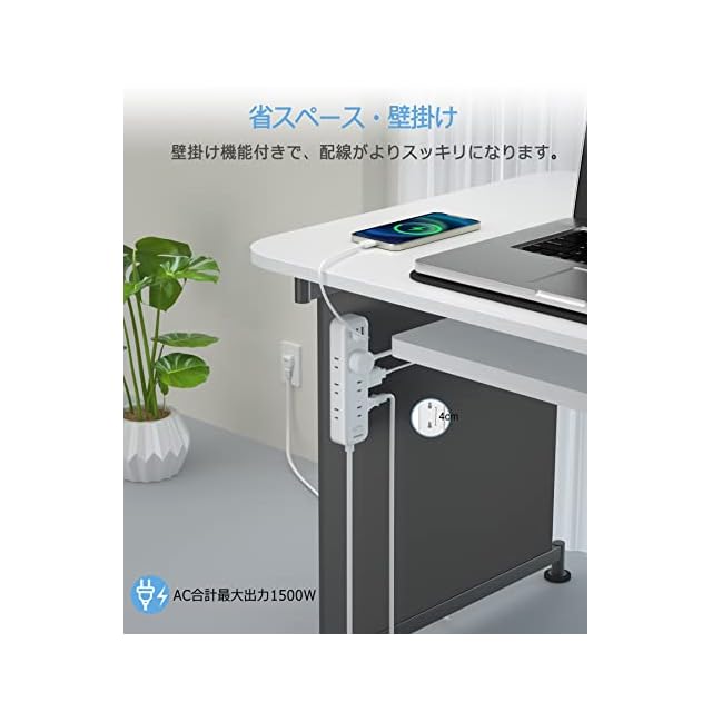 「壁掛け用·卓上に」:コンセントタップは壁等に仮固定できるフック穴付き、壁にかけてご利用できます。省スペースで、配線もスッキリになります。テーブルタップの底の四角に滑り止めがついており、卓上で安定感があります。