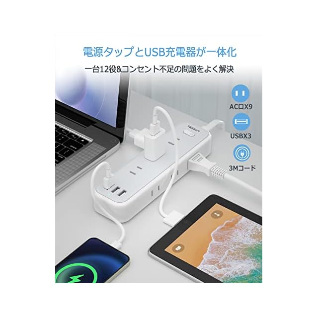 商品名:延長コード 3m 電源タップ usb たこあしコンセント テーブルタップ TESSAN 9個AC口 3個USB-Aポート タコ足配線 マルチ OA 一括スイッチ付き 壁掛け 卓上