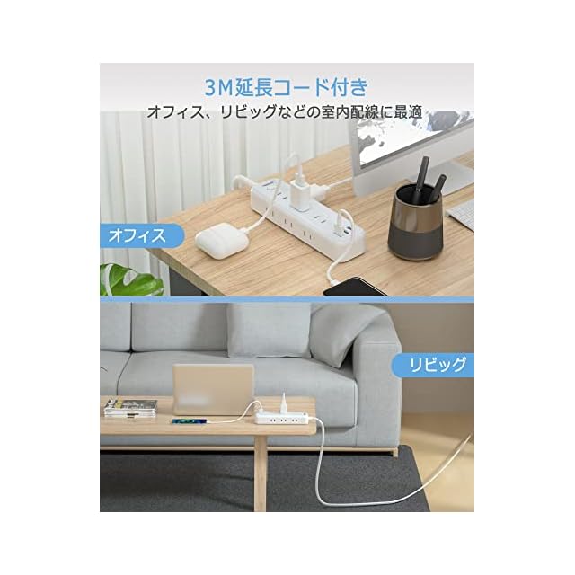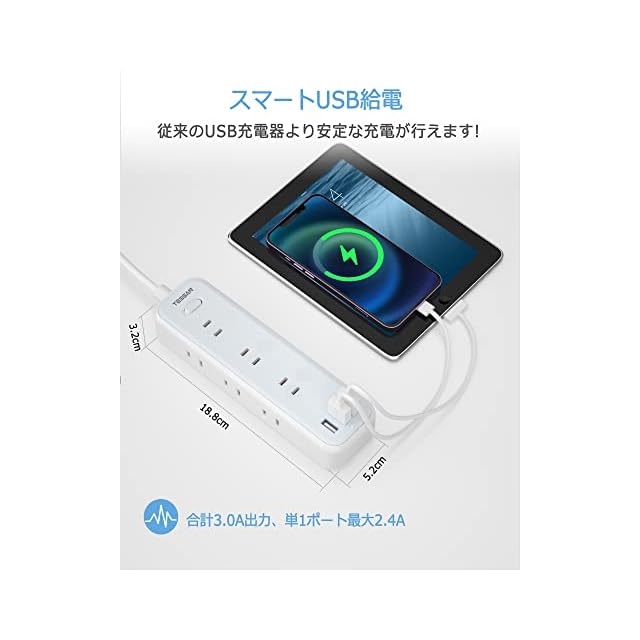 これは9個AC差込口とUSBポート3口が一体となったの12役USBタップ、沢山な機種が同時に充電で、コンセント不足が解決できます。AC口が天面・両側面に分配されて、どちら側からも気軽にケーブルを挿すことができます。3mの延長コード付きで、コンセントから少し離れた場所でも利用できます。家庭、オフィス、パーティーなどにも大活用できます。USBポートが接続した機器に最適な給電をする「自動識別IC」が搭載されていますので、従来のUSB 充電器より安定な充電が行えます、単一ポートあたり最大出力2.4A。壁掛けや卓上に両立な使い方あり、省スペースで、配線もスッキリになります。さすがおしゃれなコンパクト電源タップ、機能的でデザイン性の高い。