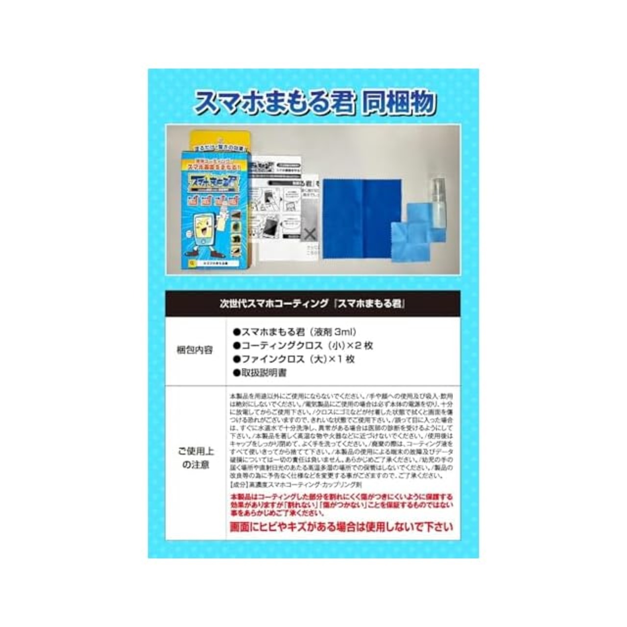 パッケージ内容:容量3ml 付属品:取り扱い説明書・ファインクロス(大)1枚・コーティングクロス(小)2枚
