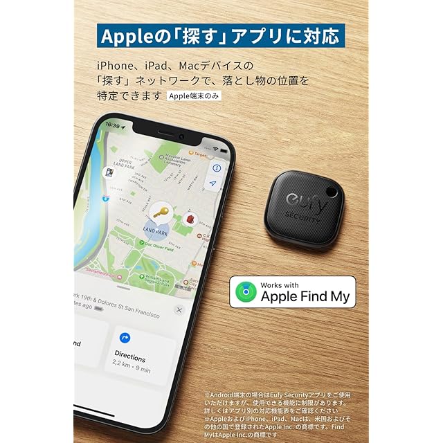 Appleの「探す」に対応:iPhone、iPad、Macデバイスの「探す」ネットワークで、落とし物の位置を特定できます。※一部機能は非対応。※「探す」機能はApple端末のみ対応。