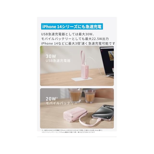コンパクトながらパワフル:充電器としては最大30W、モバイルバッテリーとしても最大22.5W出力です。iPhone 14シリーズにも最大3倍速く急速充電が可能です。また本体表面にはディスプレイを搭載し、バッテリーの残量をリアルタイムかつ一目で確認できます。※一般的な5W出力の充電器でiPhone 14を0%から30%まで充電した場合との比較(Anker調べ)※モバイルバッテリーとしてiPhone機器を充電する際、最大出力が20Wになります。※USB-C対応機器を充電するには、別売りのUSB-C&USB-Cケーブルをご利用ください。