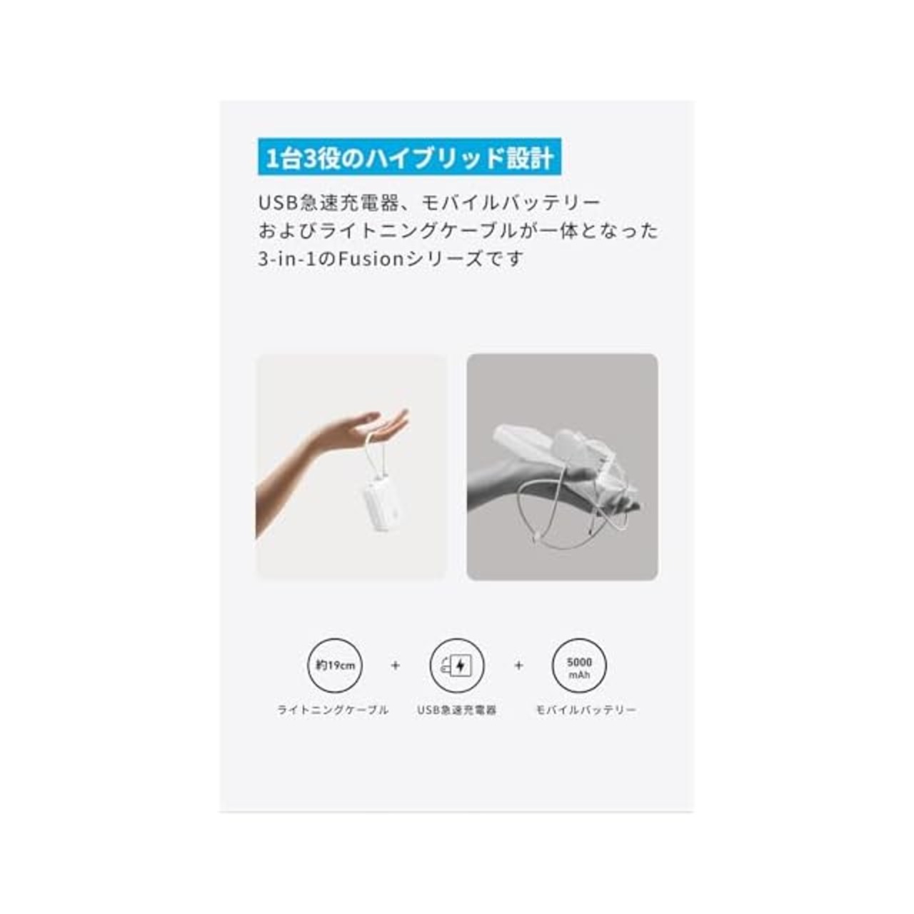 1台3役のハイブリッド設計:USB急速充電器、モバイルバッテリーおよびライトニングケーブルが一体となった3-in-1のFusionシリーズ。