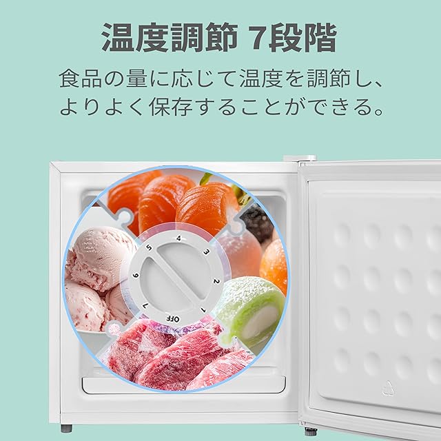 【温度調節】7段階温度調節する。食品の量に応じて温度を調節し、よりよく保存することができる。