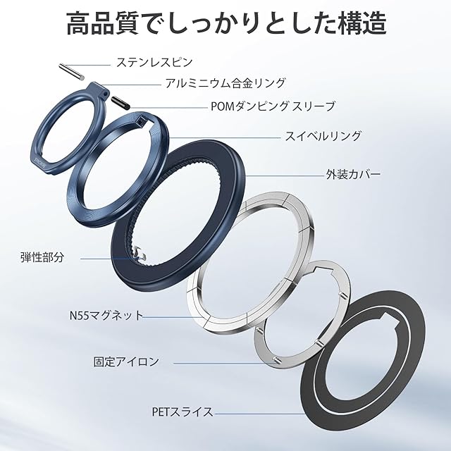 超軽量ながら超强磁力:わずか26.3g、超軽量!たっだ指一本でスマホの落下を防止。業界最強N55磁石で強力な磁吸力を実現し、約1.4KGまでの荷重に耐えます。iPhone16 Pro Maxの重さでも問題なく使用できます。