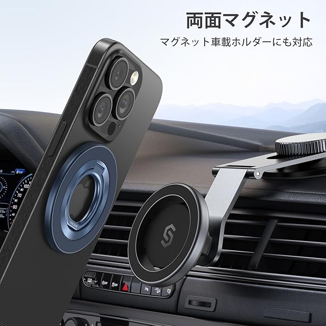 360度回転:360°横回転と90°縦スイングで、角度調整が自由に。6,000回折りたたんでもリングが緩まないテスト済み。ベース内部に金属を採用し、マグネット式の車載ホルダーにも取り付け可能です。 ワイヤレス充電に便利:Magsafe機能が非対応スマホもワイヤレス充電機能があればOK。ワイヤレス充電する際にはスマホリンクを取り外せば充電できます。