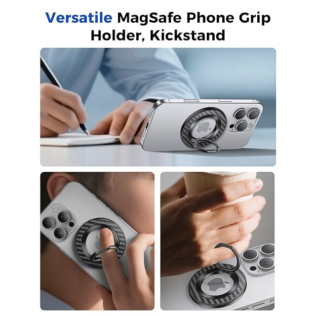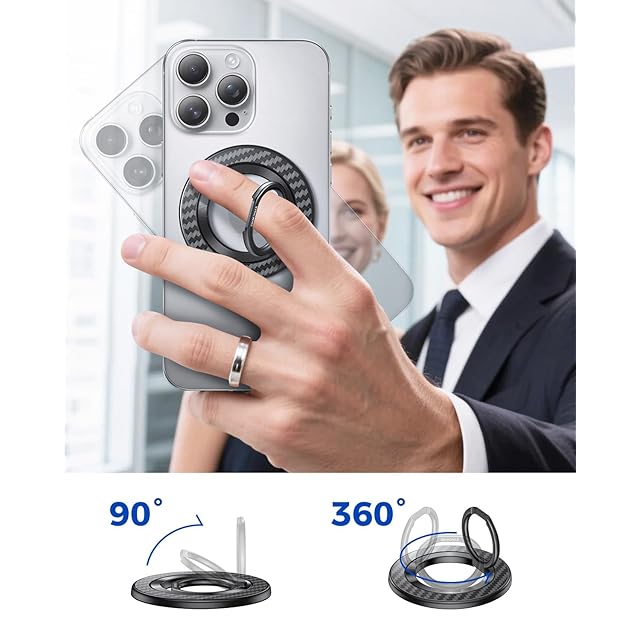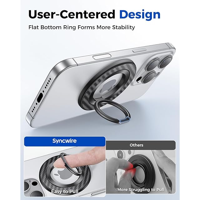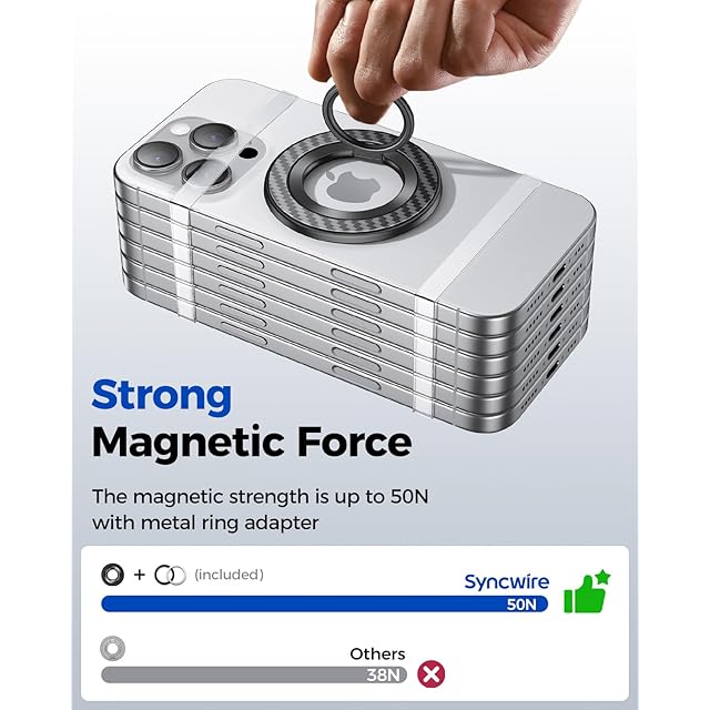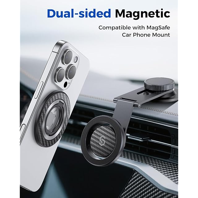 【超強力磁力】Syncwire カーボンファイバー マグネット式スマホリングホルダーは、N55 NdFeB マグネットを使用しており、優れた磁力を提供します。指一本でスマホをしっかりとMagSafe マグネット式スマホリングホルダーに固定でき、揺れや動きを防ぎます。付属のメタルリングを使用すると、磁力が5倍に強化されます。
