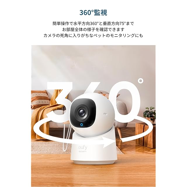 360°監視:Eufy Securityアプリから簡単操作で水平方向360°と垂直方向75°までお部屋全体の様子を確認可能。カメラの死角に入りがちなペットのモニタリングにも最適です。