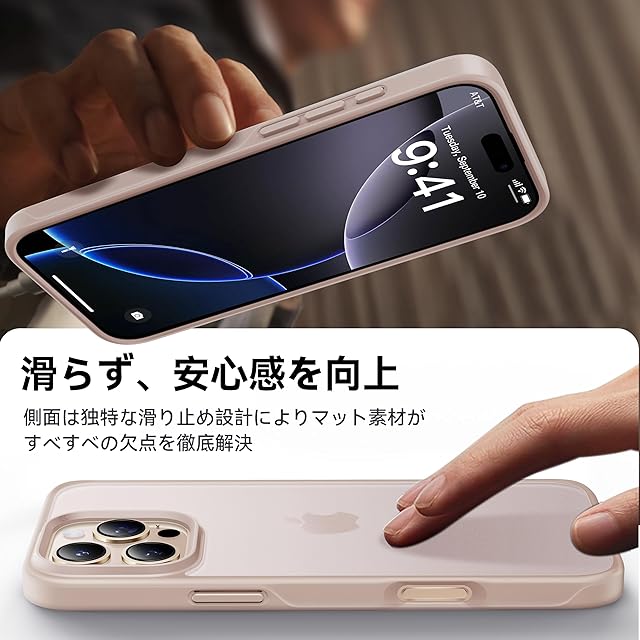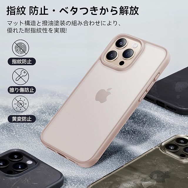 【滑り止め&指紋防止・すごく持ちやすさ】艶消しでマットな質感で手に持った時は背面が滑ることもなくフィットして、サラサラとした触り心地が最高のケース!また、側面の滑り止め設計により、滑りにくさが5倍向上し、持ち心地が従来品より63%改善。手にしっかり馴染み、滑り落ちる心配もない。特許取得済みの撥油塗装で、5年後でもさっぱりした質感を維持し、指紋の付着問題を完全に解消!マットな質感、触り心地、見た目、どれを取っても優勝!