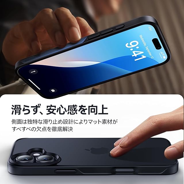【滑り止め&指紋防止・すごく持ちやすさ】艶消しでマットな質感で手に持った時は背面が滑ることもなくフィットして、サラサラとした触り心地が最高のケース!また、側面の滑り止め設計により、滑りにくさが5倍向上し、持ち心地が従来品より63%改善。手にしっかり馴染み、滑り落ちる心配もない。特許取得済みの撥油塗装で、5年後でもさっぱりした質感を維持し、指紋の付着問題を完全に解消!マットな質感、触り心地、見た目、どれを取っても優勝!