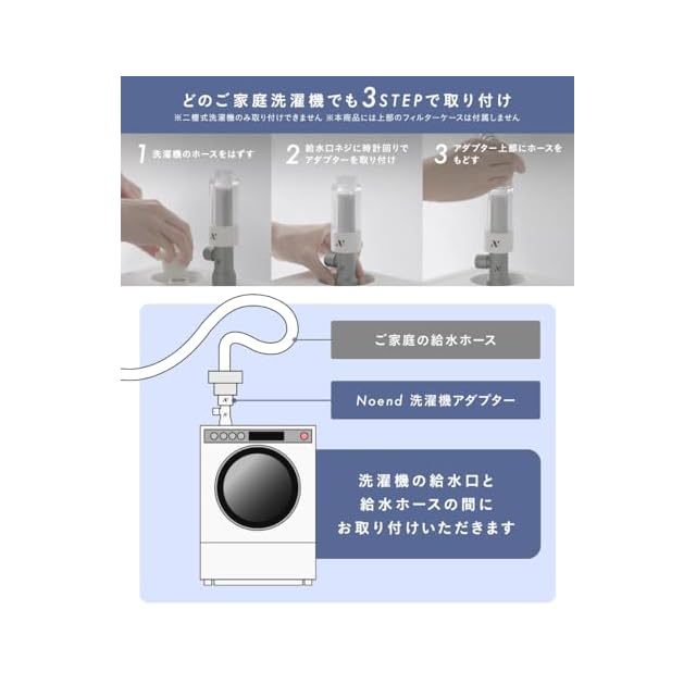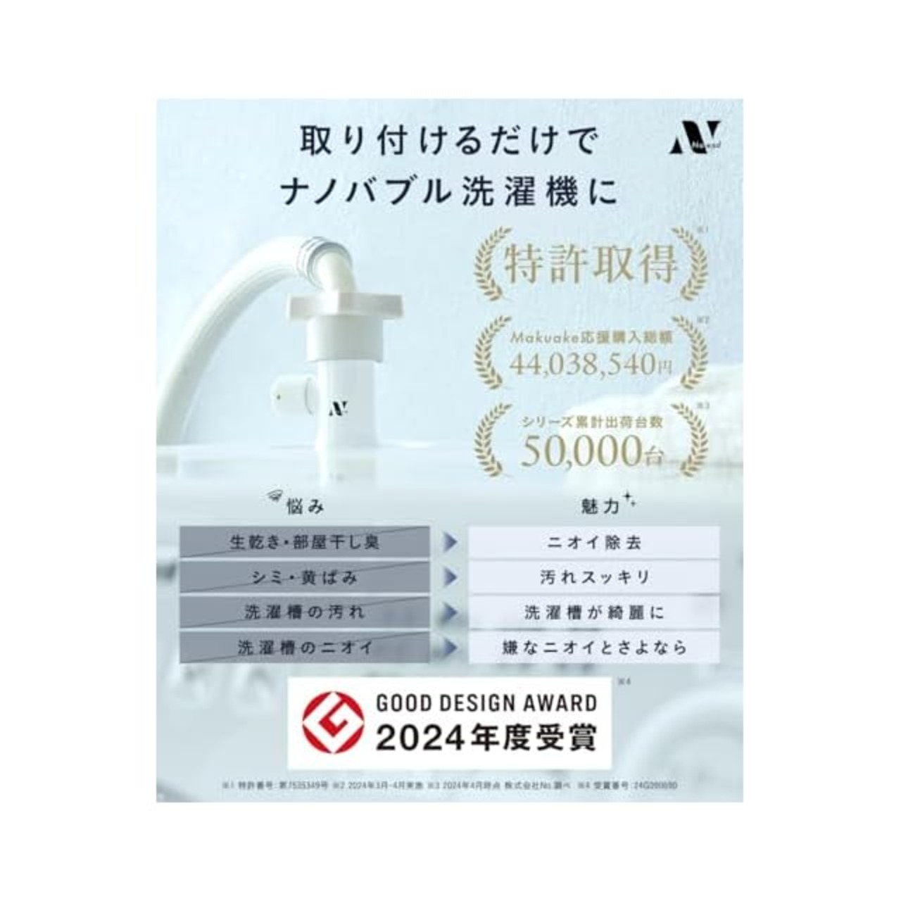 商品名:Noend オーガニックファインバブル洗濯機アダプター ナノバブル発生器 【汚れ除去|ニオイ除去|洗濯槽洗浄】【国内ブランド|特許取得|日本初】【タテ型洗濯機/ドラム式洗濯機対応|工具不要】 グッドデザイン賞2024年度受賞 (アダプター単品/ホワイト)