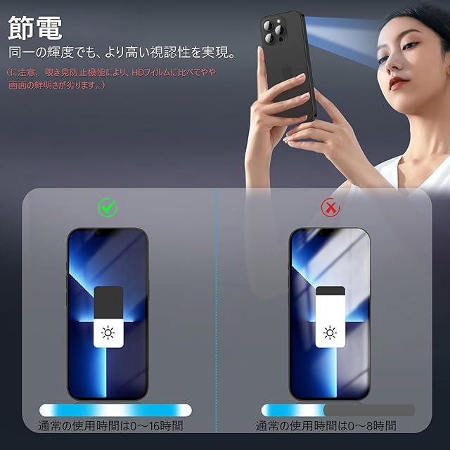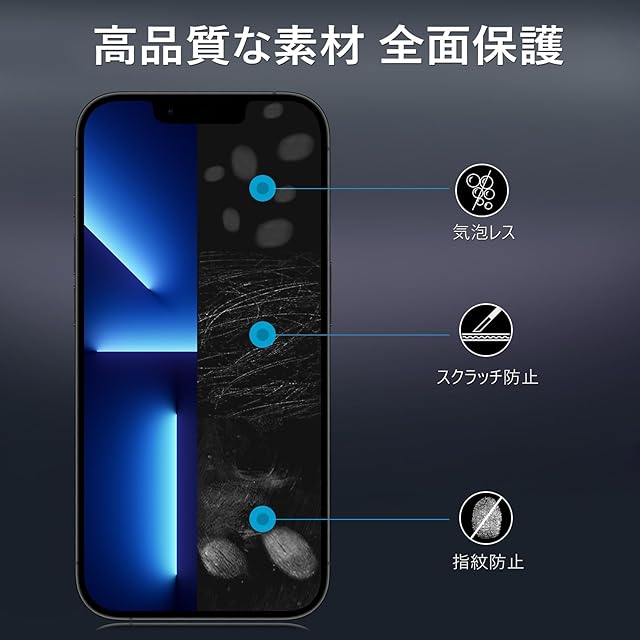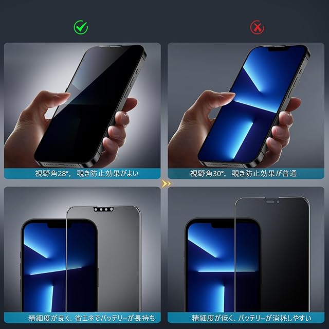 【360度覗き見防止,プライバシーフィルム】 iPhone13Promaxの360度覗き見防止フィルム,上下左右4方向の360度(前から约28度の視視角)のぞき見防止。正面から見る時はっきり見える、高透過率があり,側方から見るときにはブラインドを通して画面が徐々に暗くなる。画面の表示内容や個人情報は完璧に保たれ、周りからののぞきを心配せずにLINEやメールを交換できます。