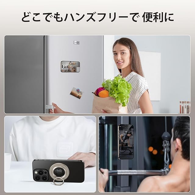 両面磁力デザイン:両面磁力(耐荷重量最大5KG)なので冷蔵庫、ジムのマシン、マグネット車載ホルダー等にピタッとくっ付けられ、様々なシーンで大活躍!更に、スマホを安定して支えるため、リングの底部が平らになっています。スマホスタンドとしても安定感が抜群。