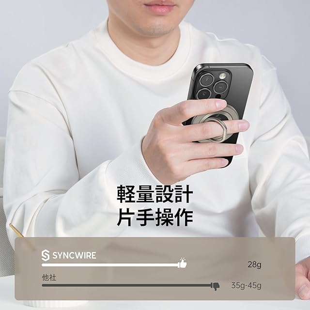 超軽量ながら超强磁力:わずか26.3g、超軽量!たっだ指一本でスマホの落下を防止。業界最強N55磁石で強力な磁吸力を実現し、約1.4KGまでの荷重に耐えます。iPhone16 Pro Maxの重さでも問題なく使用できます。